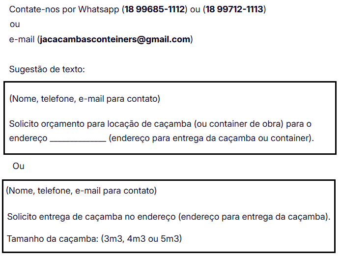 Acrescente no campo de mensagem seu telefone e endereço para colocação da caçamba ou container.